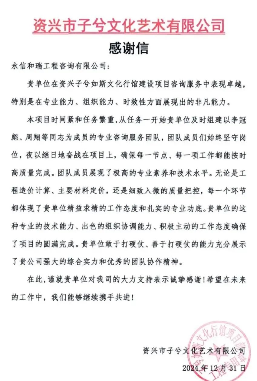 資興市子兮文化藝術(shù)有限公司對大灣區(qū)深圳分公司所提供的服務(wù)給予高度評價,對我司在專業(yè)能力、組織能力、時效性方面展現(xiàn)的非凡能力表示贊賞,并對我司的大力支持表示誠摯感謝。未來我司將在造價咨詢這一傳統(tǒng)優(yōu)勢領(lǐng)域繼續(xù)深耕,延續(xù)一以貫之的硬實力、高水準(zhǔn),進一步在更多不同地區(qū)擴展業(yè)務(wù)版圖。