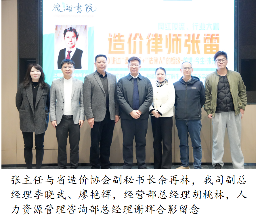 在法治中國建設與行業高質量發展的雙輪驅動下,造價與法律的融合已然成為業內剛需。這不僅體現在具體業務層面,更將重塑工程造價的價值定位,使其從傳統咨詢服務向高質量戰略智庫轉型。3月9日,上海源勤律師事務所主任張雷律師蒞臨我司開展專題培訓,深度解析以法律思維指導造價管理的必要性及其具體應用,以期助力從業人員精準把握行業政策動向、提升法律風險防控能力。本次講座由永信和瑞與后湖書院主辦,省造價協會副秘書長佘再林作為嘉賓出席講座。我司副總經理李曉武、廖艷輝,經營部總經理胡桃林,人力資源管理咨詢部總經理謝輝帶領造價業務板塊全體人員參與交流。